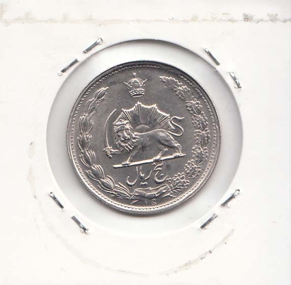 پشت سکه : پنج ریال – شیر و خورشید – برگ زیتون و برگ بلوط – تاج