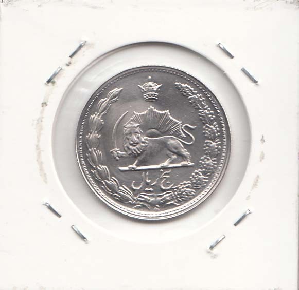 پشت سکه : پنج ریال – شیر و خورشید – برگ زیتون و برگ بلوط – تاج